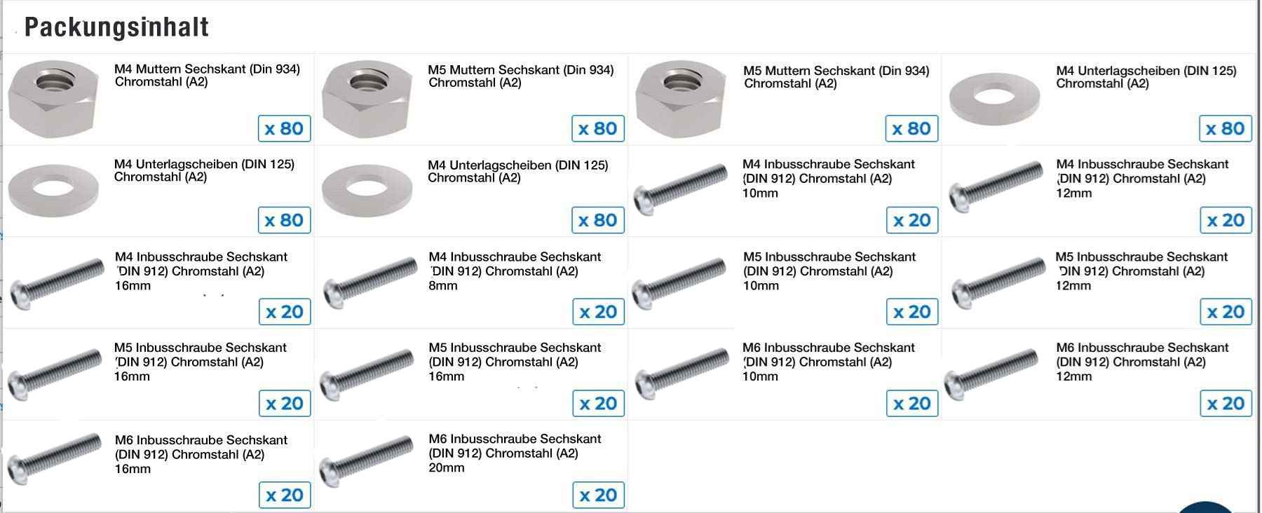 Nuts Included Cap Head Head Type Yes Washers Included Socket Drive Type Small (M4 - M6) Sizes 8mm - 20mm Length Range (L) A2 Stainless Steel Material M4, M5, M6 Thread Sizes 240 Total No. of Screws 5 No. of Lengths 240 Total No. of Nuts 720 Total No. of Components